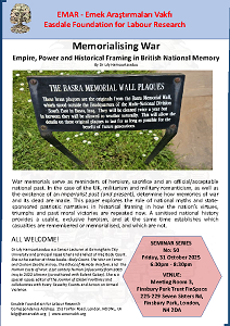 War memorials serve as reminders of heroism, sacrifice and an official/acceptable national past. In the case of the UK, militarism and military romanticism, as well as the existence of an imperialist past (and present), determine how memories of war and its dead are made. This paper explores the role of national myths and state-sponsored patriotic narratives in historical framing in how the nation’s virtues, triumphs and past moral victories are repeated now. A sanitised national history provides a usable, exclusive heroism, and at the same time establishes which casualties are remembered or memorialised, and which are not.